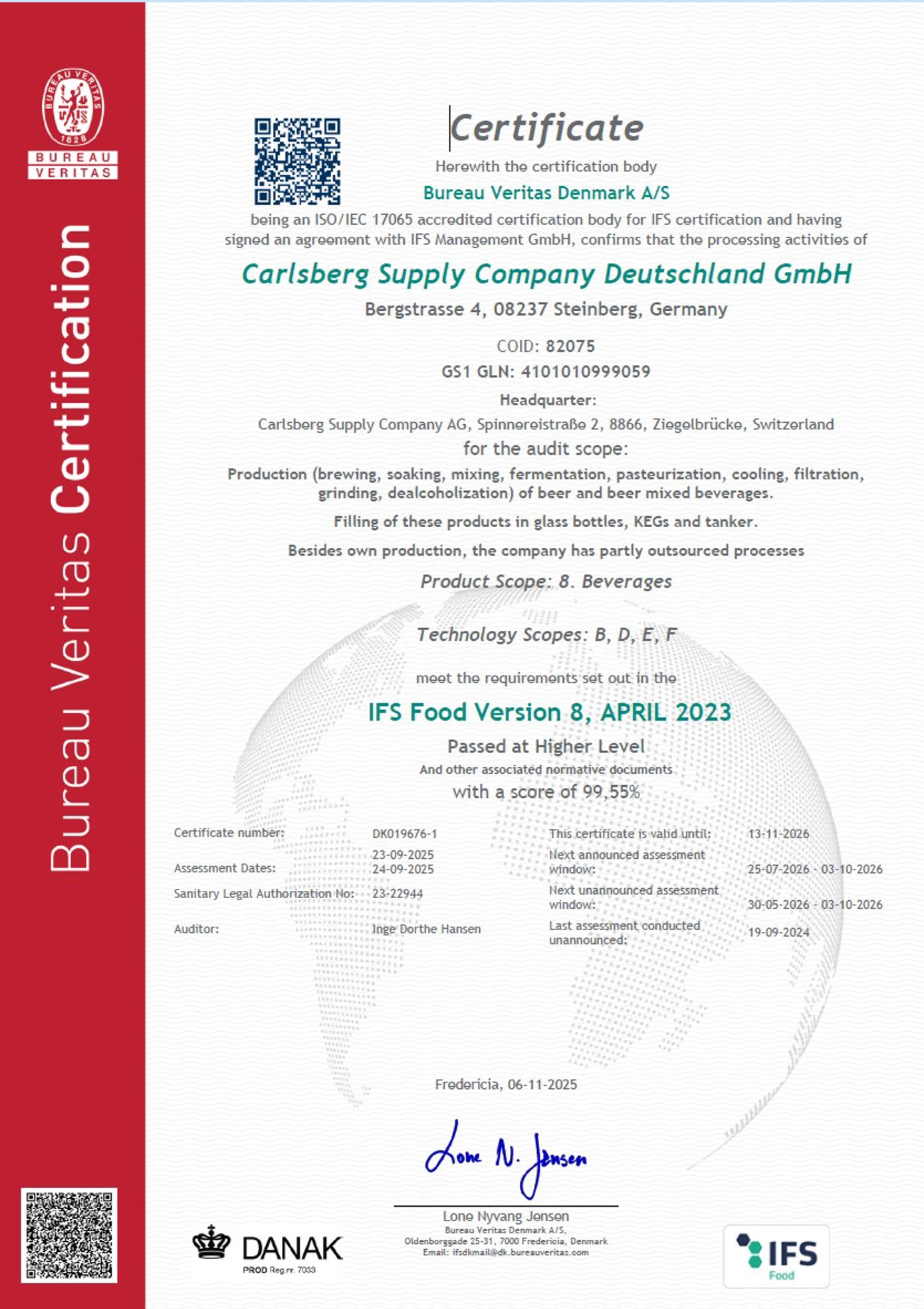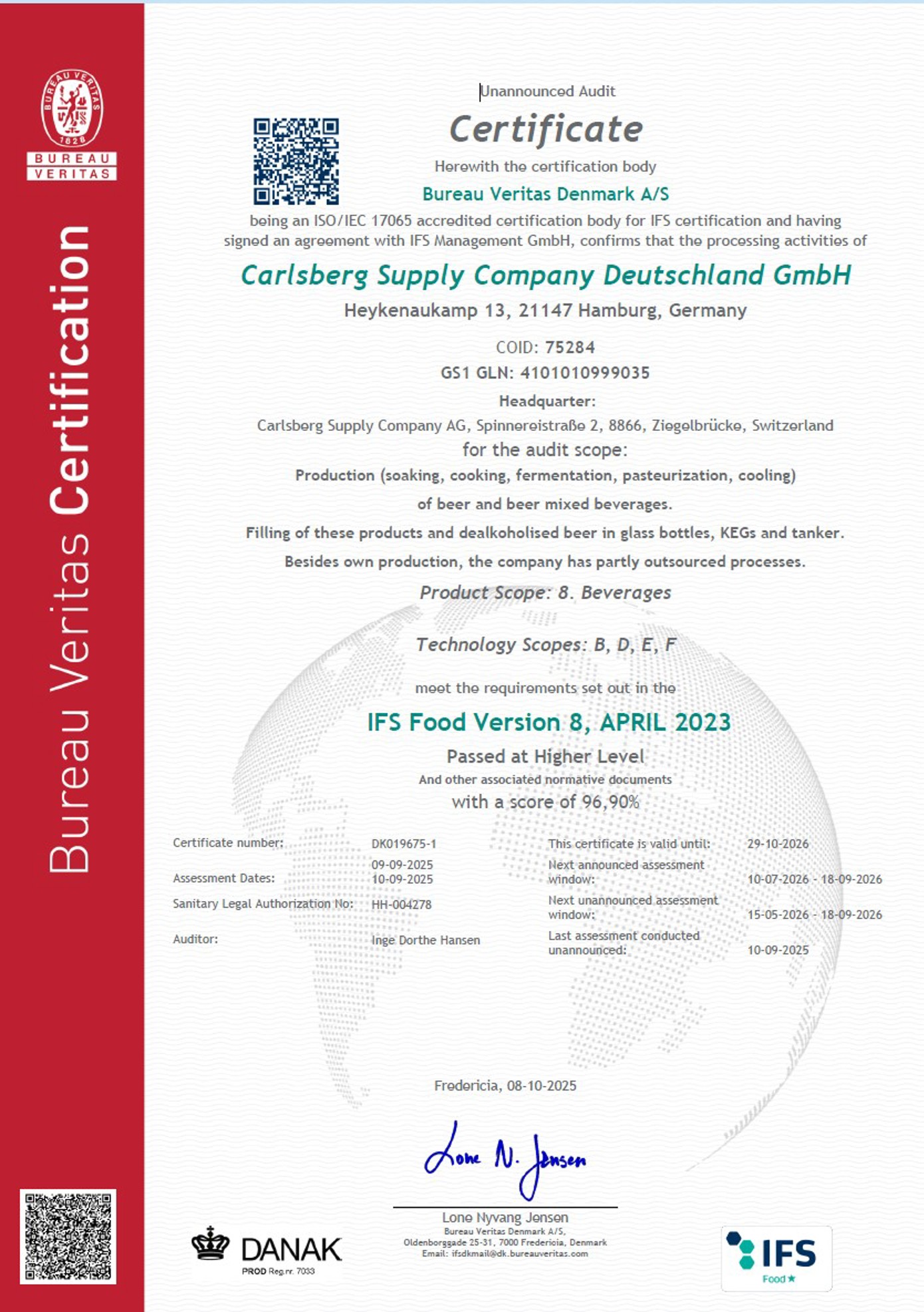 Lebensmittelsicherheit hat in unserem Hause höchste Priorität. Deshalb erfüllen wir die Anforderungen des "International Food Standard". In regelmäßigen Audits werden diese Anforderungen durch eine externe Organisation überprüft und das Ergebnis bestätigt.